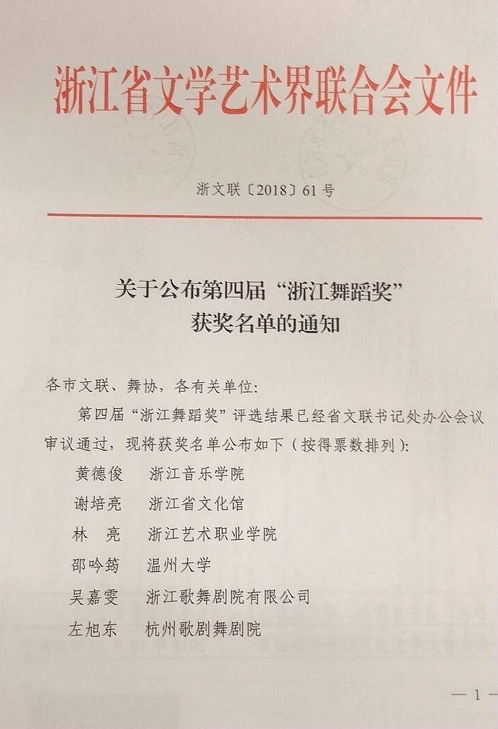舞蹈系教师林亮、李毅源喜获第四届“浙江舞蹈奖” 迄今我校有8人获此荣誉