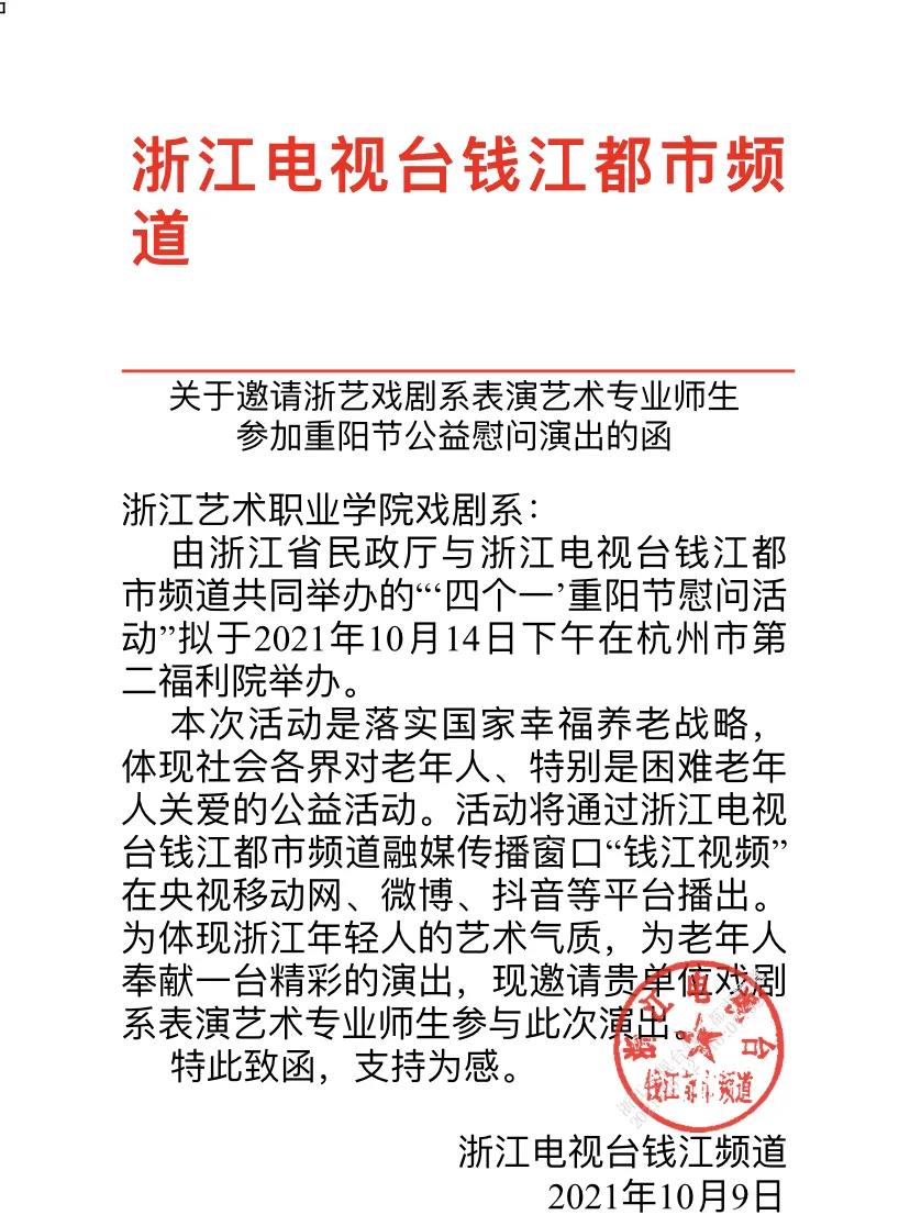 岁岁重阳,今又重阳。10月14日下午,由浙江省民政厅、浙江电视台钱江都市频道共同举办的重阳节慰问演出在杭州市第二福利院举行。浙艺戏剧系教师带领2019级演艺一贯班学生参加了此次公益演出。