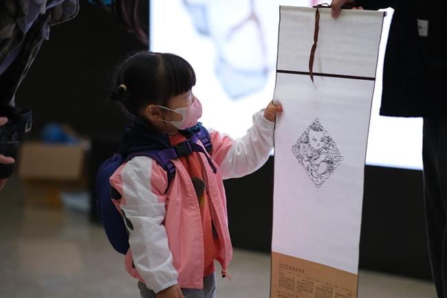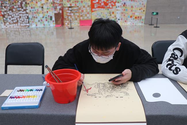 本次活动中,手工艺学院民族传统技艺专业教师高迅为观众揭开了水印木刻的神秘面纱,现场示范了印刷、手工上色等一系列制作流程。将年历对好位置,用镇尺压牢固。掀开年历,用毛笔蘸取黑色水墨涂抹在已刻好的木板上,再用圆刷刷匀版面上的水墨。覆上年历,用马莲在年历的背面施力印刷,在确保所有的图形印刷到位后揭开。现场观众看得全神贯注,颇有兴趣。