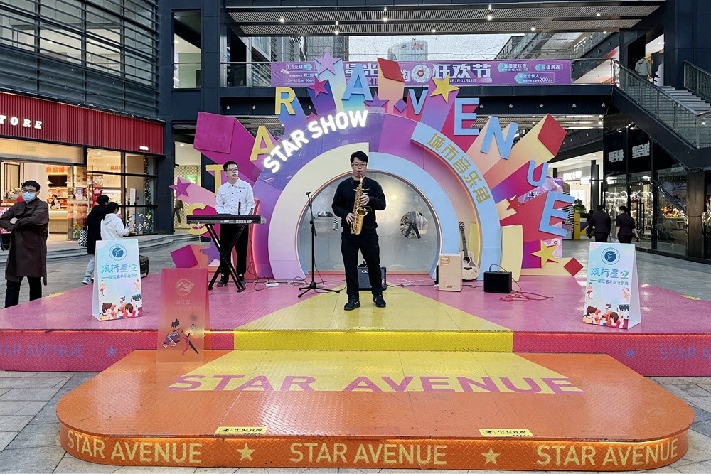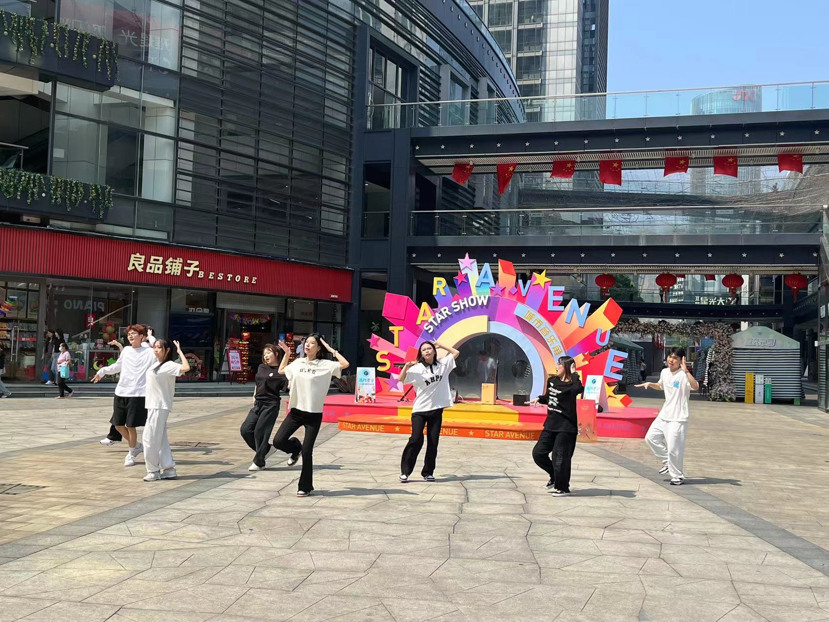 在星光大道电影文化艺术街区,音乐学院流行教研室、声乐教研室和街舞社共同打造“流行星空”