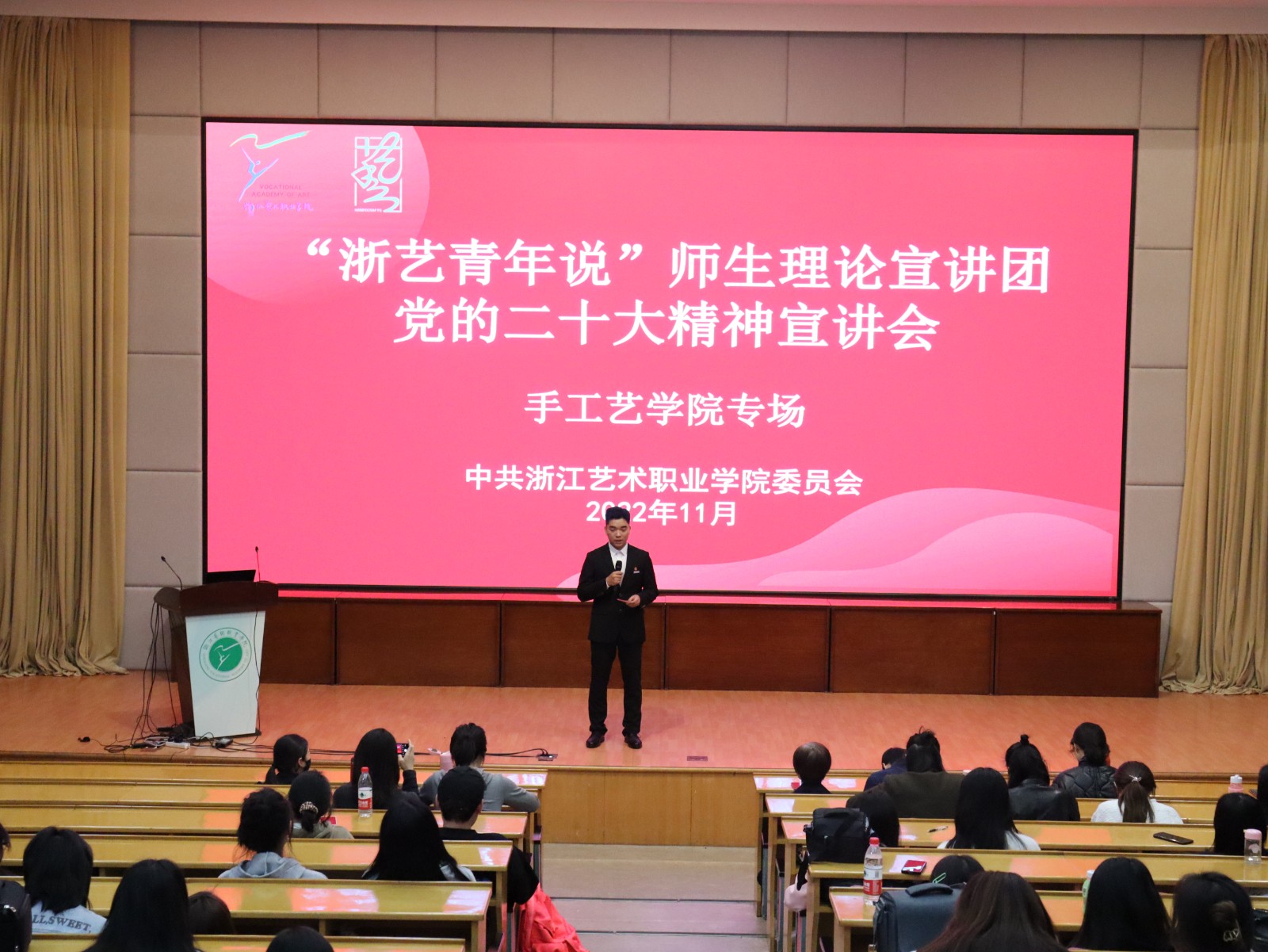 为学习宣传贯彻党的二十大精神,切实把全校广大党员、师生的思想和行动统一到党的二十大精神上,激发浙艺师生们政治理论学习的动力,构筑起青年一代的强大精神支柱,学校于今年5月启动了“浙艺青年说”师生理论大宣讲活动。11月23日,“浙艺青年说”师生理论宣讲团党的二十大精神宣讲会——手工艺学院专场在图信中心报告厅顺利开展。手工艺学院全体教师、各班党章学习小组的成员齐聚于此,聆听十位师生的激情宣讲,深入学习党的二十大精神。