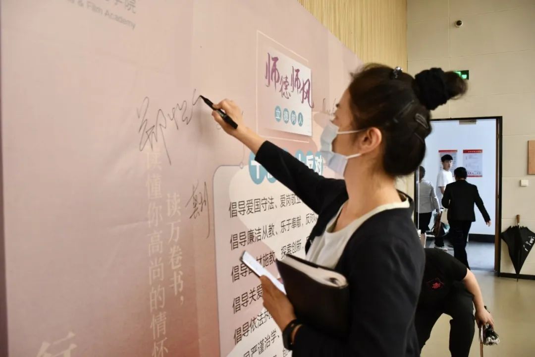 全体教师签署了《戏剧影视学院师德师风个人承诺书》,在师德师风,立德树人——“十倡导 十反对”倡议展板上签字,郑重承诺以德立教、廉洁从教、静心教书、潜心育人,争做“四有”好教师。