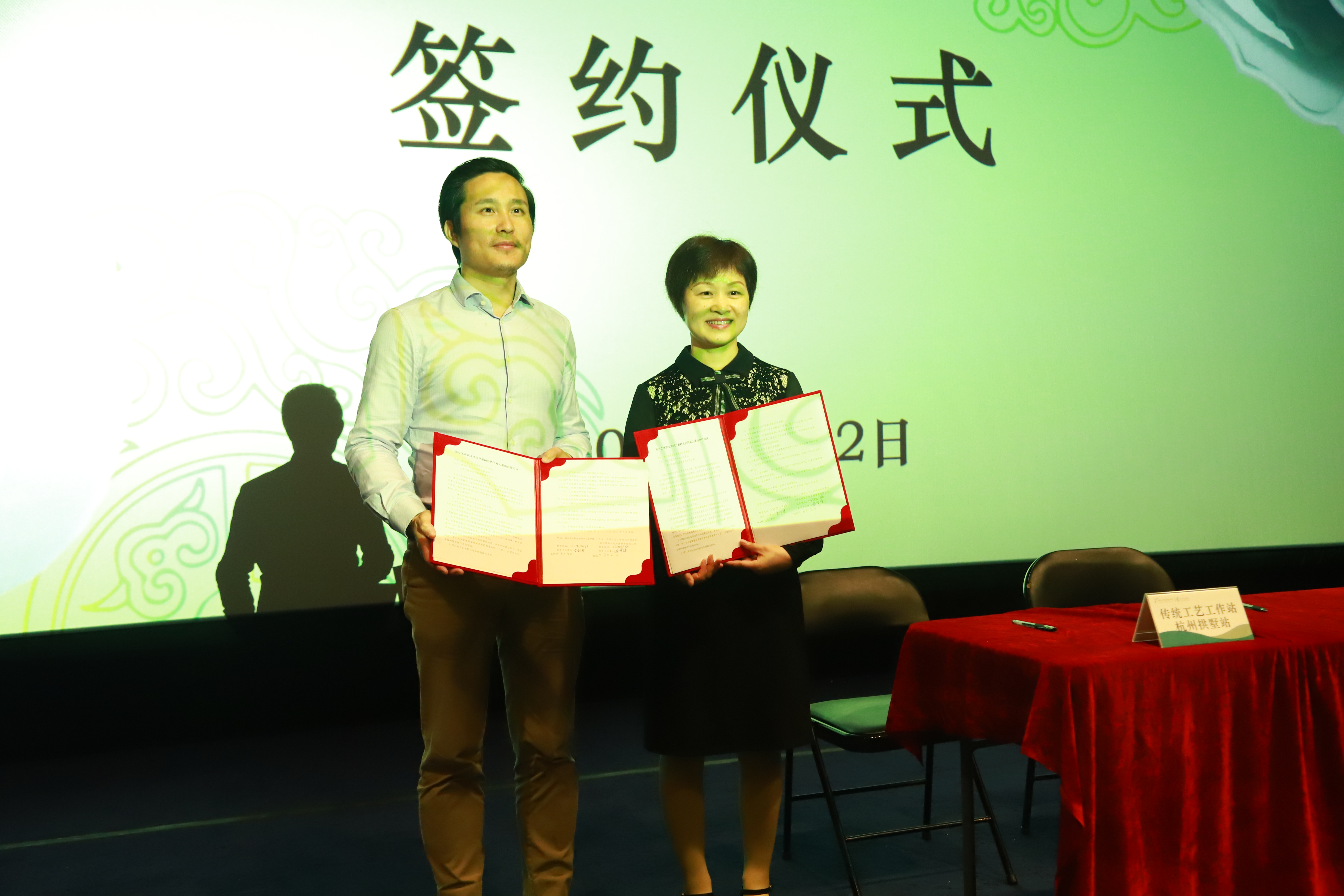 李罕梁和金银琴进行产教融合协同育人合作协议签署和揭牌。传统工艺工作站杭州拱墅站于2019年经文化和旅游部非遗司批准成立,积极探索城市非遗保护的模式与路径,致力于提升传统工艺核心技艺,培育和孵化融入当代生活的非遗产品,让非遗焕发夺目的时代光彩,努力打造传统工艺的“城市会客厅”。在手工艺学院和传统工艺工作站杭州拱墅站前期多次交流沟通中,拱墅站的建设发展与手工艺学院的教育教学、专业发展有诸多共通点。双方协商建立产教融合协同育人基地,探索“产、学、研、创”协同育人新模式,为传统工艺人才培养和研究、传承、传播注入新活力。