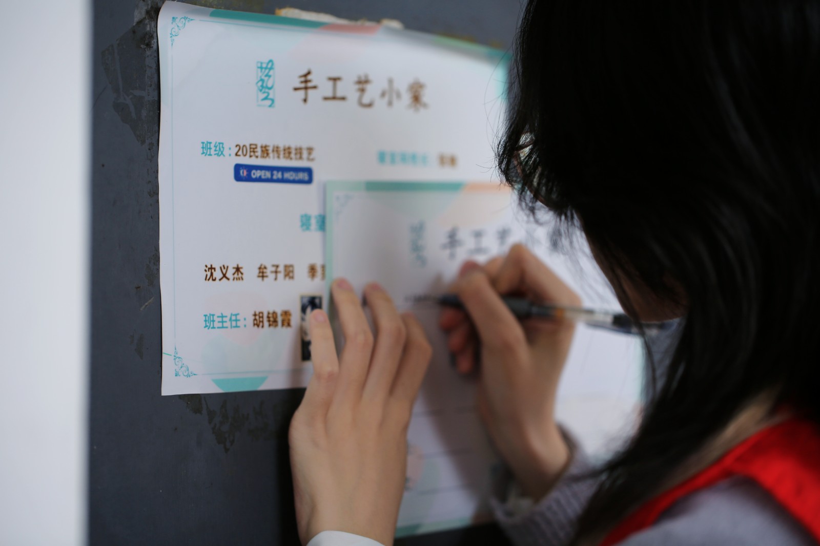 发现门上不够美观的寝室名单,有志愿者主动上前帮忙写下整洁的新名单。虽然大家双手沾满灰尘,但看到整洁如新的寝室门,每个人脸上都洋溢着明媚的笑容。