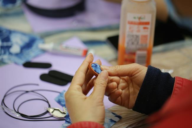 胡锦霞对蓝染制作技艺进行讲解,将“从传统中来,到现代中去”的理念放入蓝染实操体验课中。校友们经过不断询问和尝试,使用橡皮筋、木筷等工具将白色面料扎成喜爱的图案,最后浸泡入染料。在等待作品出炉时,大家还制作起了手工艺小饰品,蓝染粘贴或捆绑的纽扣、头绳和发箍纷纷问世,现场一片欢声笑语。