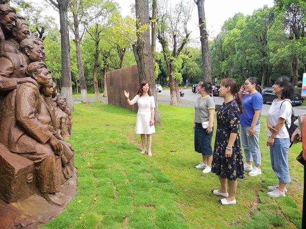 直属党支部书记刘秀峰同志带领教师们来到巨匠广场,广场南侧坐落着蔡元培、林风眠和潘天寿等人的雕塑,北侧是新立的《烽火艺程》大型纪念浮雕,刘书记介绍了这座雕塑的纪念意义。抗战全面爆发后,杭州艺专师生被迫辞别西湖,辗转各地,十迁其址;九载光阴,杭州艺专师生坚持办学、矢志不渝,堪称一条壮怀激烈的烽火艺程。在国家危难之际,艺专师生心系国之兴亡,在迁徙途中的万千白壁上书写爱国之志,让硝烟弥漫的大地变成漂泊的艺术殿堂,可谓我国艺术教育史上的卓越篇章。听着她的解说,大家对如此伟大的救亡义举而感到热血澎湃,更加珍惜当今“百花齐放、百家争鸣”的艺术盛景。